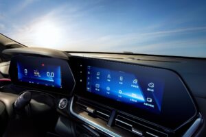 En el habitáculo dispone el mismo centro de mandos que conocimos con en el nuevo Tracker RS para China. Tiene dos pantallas empotradas en un mismo panel, corriendo un nuevo sistema operativo con soporte para actualizaciones remotas (OTA) y compatibilidad inalámbrica para Apple CarPlay.