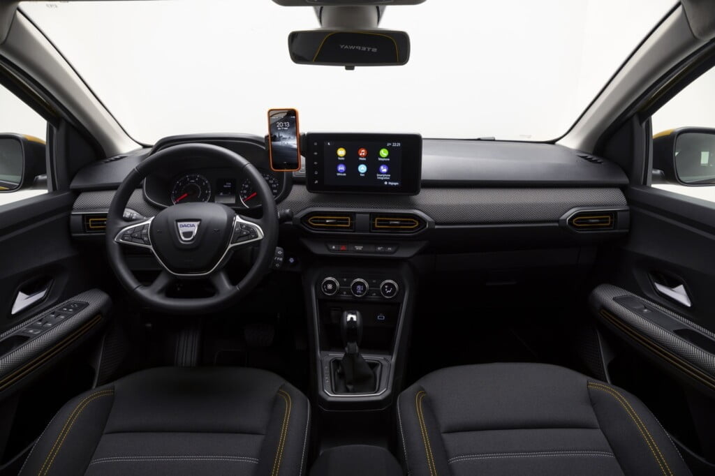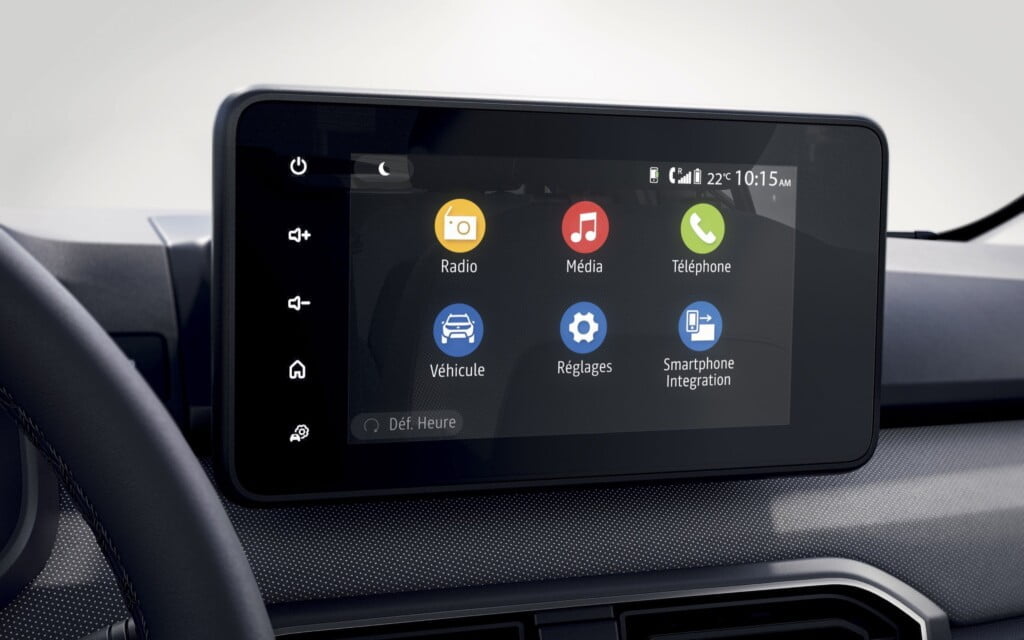 El equipamiento entre otras cosas incluye un sistema de infotainment compatible con Apple CarPlay y Android Auto, que en las versiones de entrada se puede sustituir por una tablero preparado con un soporte para celulares, el cual se integra con la aplicación Dacia Media Control que hace las tareas de sistema de entretenimiento.