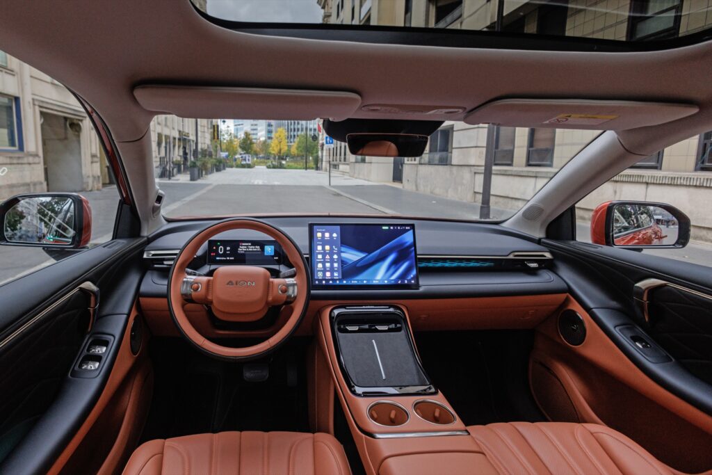 Por dentro, el Aion V tiene espacio para cinco personas. El centro de mandos incluye una pantalla táctil de 14,6 pulgadas en la consola central. Desde ahí puedes controlar todo: la climatización, el masaje de los asientos e incluso reclinarlos completamente para relajarte. Desafortunadamente, parece que no cuenta con muchos botones físicos.