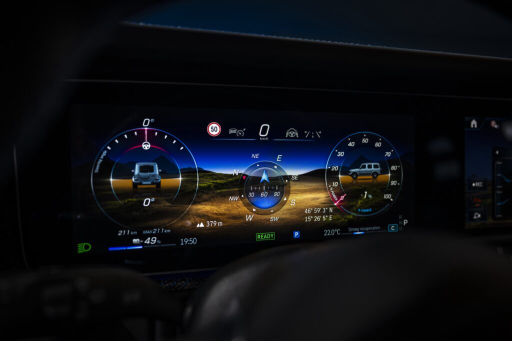 El interior se inspira en gran medida en el Clase G con motor de combustión interna, hasta el punto que no se nota inmediatamente que es un modelo distinto. Tiene las habituales pantallas de 12.3 pulgadas para el centro de mandos, además de todo el equipamiento y grado de personalización que se espera en su etiqueta de precio.