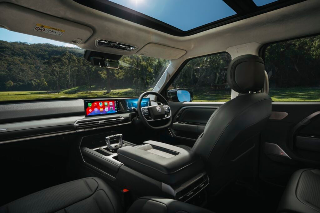 En el interior, sobresale un selector de marchas inspirado en la aviación, exclusivo de MG. El resto del habitáculo replica la Maxus Terron 9, con un clúster digital de serie compuesto por dos pantallas de 12.3 pulgadas. La versión Explore Pro añade asientos delanteros con calefacción, ventilación y masaje, asientos traseros exteriores calefactados, sistema de audio JBL de ocho parlantes, techo panorámico de vidrio y tapicería de cuero con revestimiento de gamuza en el techo.
