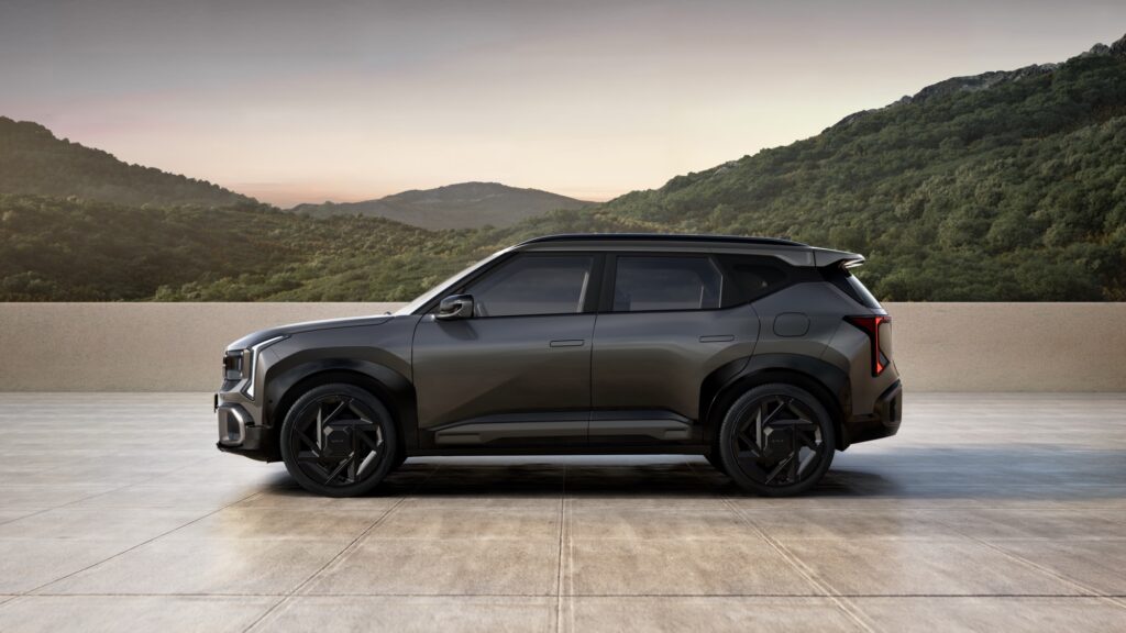 De perfil, comparte el ADN visual del EV5, con manijas enrasadas y amplios revestimientos plásticos. La línea de cintura ascendente y el techo flotante evocan al primer Seltos, mientras que un nuevo pliegue diagonal en las puertas traseras aporta mayor tensión al diseño. En la parte trasera, destaca un alerón de techo alargado y un conjunto lumínico que recorre todo el portón, rematado con extensiones verticales en forma de reloj de arena.