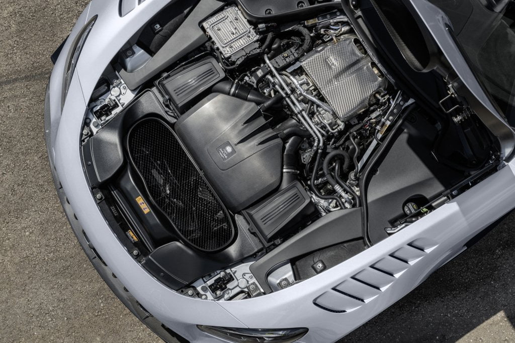 Toda esta potencia es enviada al tren trasero y manejada por una transmisión AMG Speedshift DCT 7G, de doble embrague y siete velocidades, a través de un eje de transmisión de carbono, que pesa apenas 13,9 kg. Esta transmisión cuenta con refrigeración adicional para poder digerir las 590 lb-pie de torque.