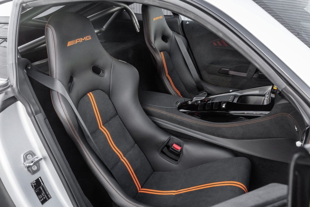 Mercedes-AMG GT Black Series (Kraftstoffverbrauch kombiniert: 12,8 l/100 km, CO2-Emissionen kombiniert: 292 g/km), 2020, Interieur, Schalensitz, Autositz, AMG Schalensiz aus Carbon mit orangen Kontrastziernähten Mercedes-AMG GT Black Series (combined fuel consumption: 12,8 l/100 km, combined CO2 emissions: 292 g/km), 2020, Interieur, seat, AMG seat in carbon with orange contrast stitching
